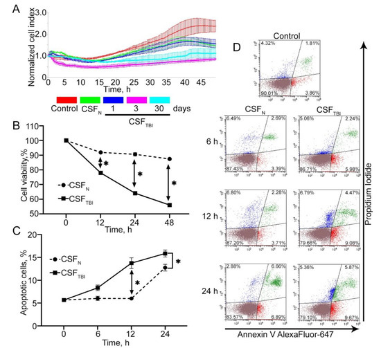 Presentation of an in vitro model for studying secondary damage after traumatic brain injury (TBI). (A) Cell index data produced using an xCELLigence device. The graph shows the dynamics of the C6 cellular index placed in a medium containing 30% of rat’s cerebrospinal fluid (CSF), received after 1, 3, or 30 days after TBI (CSFTBI). Control: CSF in medium was replaced by phosphate buffer saline (PBS). CSFN: CSF from non-traumatized rats was used as a negative control. (B) Results of analysis with the aid of the 3-(4,5-dimethylthiazol-2-yl)-2,5-diphenyltetrazolium bromide test (MTT). The CSF sample obtained three days after TBI was incubated with C6 cells for 12, 24, and 48 h. (C) The results of Annexin V staining. The measurement was provided with the aid of flow cytometry technique. C6 cells were incubated with CSF for 6, 12, or 24 h. (D) The distribution of the cell population according to flow cytometry data. Data of three independent experiments presented as mean ± SEM. Statistical significance is indicated as * p < 0.05.