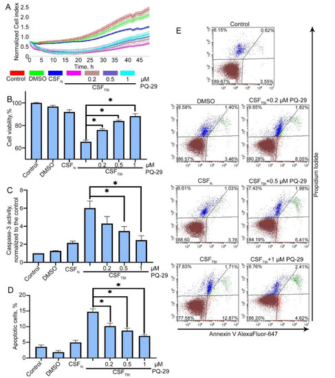 PQ-29 reduces apoptosis and induces the viability of acceptor cells in the presence of CSF from traumatized rats. C6 cells were cultured in the presence of CSF from traumatized rats. CSF:growth medium ratio was 1:1. Control: CSF in medium was replaced by PBS; dimethyl sulfoxide (DMSO) was used as a vehicle; CSFN: CSF from non-traumatized rats was used; CSFTBI: CSF from traumatized rats was used; PQ-29 was added to cell culture medium immediately after CSF in the concentration marked on the figure. (A) Cell index data produced using an xCELLigence device. The graph shows the dynamics of the C6 cellular index placed in a medium containing rat’s CSF. (B) The results of the MTT-test. Cells were incubated with CSF for 24 h. (C) The results of the caspase-3 activity assay. Cells were incubated with CSF for six hours. (D) The results of Annexin V staining. The measurement was provided with the aid of flow cytometry technique. Cells were incubated with CSF for six hours. (E) The distribution of the cell population according to flow cytometry data. Data of three independent experiments presented as mean ± SEM. Statistical significance is indicated as * p < 0.05.