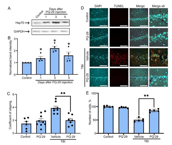 The graph in Figure 4С shows the absolute values of the coefficient of slipping obtained from the taper track test. Increased values corresponded to impaired motor function. One month after TBI in rats, this parameter was 4.6 ± 0.77; at the same time, in rats treated with PQ-29, the coefficient of slipping was lower, 2.27 ± 0.48, which was not statistically distinct from the two control groups (1.97 ± 0.57 and 2.17 ± 0.41) (Figure 4C). Immunohistochemical staining showed a significant reduction in the number of neurons in the CA1 field of the hippocampus of injured rats, down to 48.3 ± 9.6% as compared to non-injured animals (Figure 4B,C). The therapy partially prevented neuronal death, elevating the proportion of surviving cells to 87.54 ± 6.4% related to that of the control. The results obtained when the brain sections were stained with the TUNEL kit showed that the majority of neurons were stained, whereas the administration of PQ-29 completely blocked apoptosis and stopped neurodegeneration (Figure 4D,E). Thus, the novel Hsp70 inducer demonstrated its effectiveness as a promising tool for rehabilitation therapy after traumatic injury.