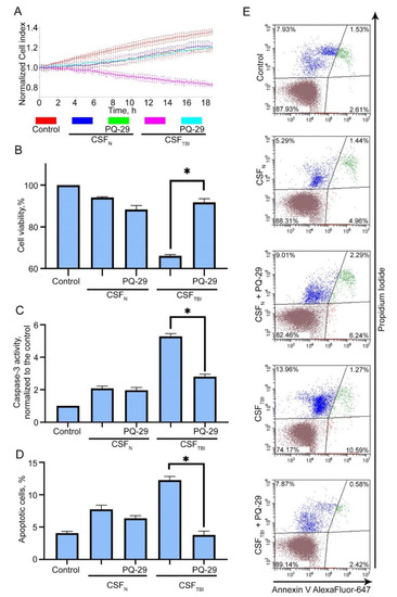 The treatment of traumatized animals with PQ-29 reduced the cytotoxicity of rat’s CSF. CSF samples were collected from traumatized and treated rats 34 days after TBI, mixed with growth medium (in volume ratio 3:7), incubated with C6 cells, and analyzed as described above. Control: CSF replaced by PBS; CSFN: growth medium containing CSF from non-traumatized rats; CSFTBI: growth medium containing CSF from traumatized rats; PQ-29: growth medium containing CSF from rats treated with PQ-29. (A) Cell index data produce using an xCELLigence device. The graph shows the dynamics of the C6 cellular index placed in a medium containing 30% of rat’s CSF. (B) The results of the MTT-test are presented. Cells were incubated with CSF for 24 h. (C) The results of the caspase-3 activity assay were demonstrated. Cells were incubated with CSF for six hours. (D) The results of Annexin V staining are presented. The measurement was provided with the aid of flow cytometry technique. Cells were incubated with CSF for six hours. (E) The distribution of the cell population according to flow cytometry data is presented. Data of three independent experiments presented as mean ± SEM. Statistical significance is indicated as * p < 0.05.