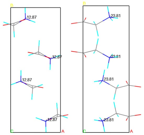 Results of Gauge Including Projector Augmented Waves Nuclear Magnetic Resonance (GIPAW NMR) chemical shielding anisotropy calculations for the N atom of the α glycine crystal structures. On the left powder X-ray diffraction (PXRD) structure (−12.87 ppm), on the right single crystal X-ray diffraction (SCXRD) structure (−23.81 ppm). Experimental value: −12.35 ppm. Source: author’s archive, more details [71].