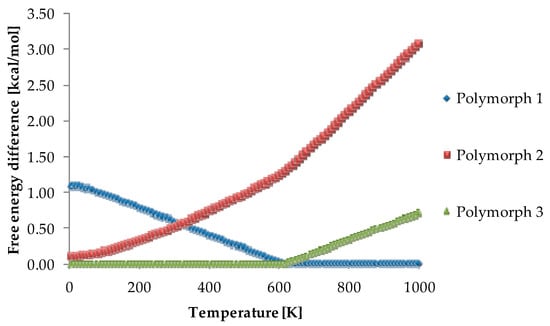 Another topic connected with a surface property is fracture of particles. The process of micronization imposes an effect on the surface energy of a substance. An increase in polar surface can result in smearing and stickiness of the material [107]. Such changes are of a decisive importance for the drugs’ production and thanks to DFT calculations can be described and understood on the atomic level. As both temperature and pressure are imposed on the substances while the tableting process, it has in itself an immense influence on the tablet components state [115]. Under the applied conditions, a polymorphic transition may take place which can be predicted with DFT-methodology (Figure 3) [116].