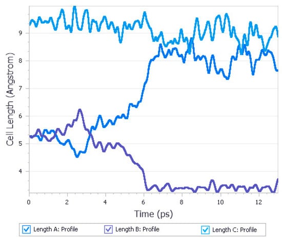 Results of molecular dynamics calculations at 3.10 GPa for urea Form I, unit cell lengths profiles. A phase transition is observed after 6 ps of simulation. The results were found to be in agreement with the experimental data as Form I is metastable and transforms into Form IV at 3.10 GPa. Source: author’s archive, more details [160].