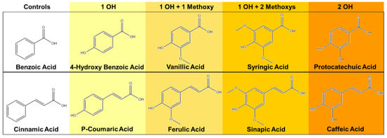In this work, hydrogen peroxide (H2O2) was utilized as an oxidizing agent to quantify the antioxidant properties of the 10 selected PAs in terms of H2O2 scavenging activity []. In general, reaction of hydroxyl groups with oxidizing agents (e.g., reactive oxygen species) forms resonance-stable phenoxy radicals, which imparts phenols with antioxidant properties []. Therefore, we hypothesized that PAs that do not contain pendant hydroxyl (OH) groups (cinnamic acid (CA) and benzoic acid (BA) controls) would not demonstrate antioxidant capability.