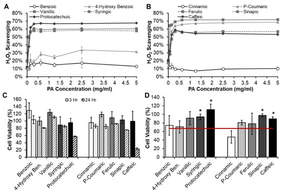 Antioxidant properties of PAs as quantified by hydrogen peroxide (H2O2) scavenging capabilities from the (A) benzoic acid group and (B) cinnamic acid group. PA (C) 3T3 cytocompatibility and (D) protective effects against H2O2 for 3T3s. Red line: DMSO + H2O2 control. * Significant increase (p < 0.05) in viability relative to DMSO + H2O2 control. n = 3, mean ± standard deviation displayed.