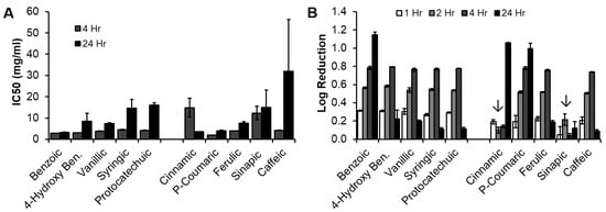 (A) IC50 and (B) log reduction of PAs against E. coli. n = 3, mean ± standard deviation displayed. Downward arrow indicates low solubility of cinnamic and sinapic acids at 5 mg/mL. Cinnamic acid solubility improved by 24 h, while sinapic acid had low solubility over the full 24-h study.