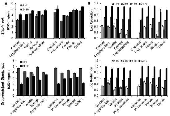 Maximum log reductions were observed at 24 h for all PAs with both Staph. epi. strains, Figure 5B. Log reductions were generally lower at all time points for drug-resistant Staph. epi. Again, no trends were observed between BA and CA-based PAs with similar ring structures. In the BA group, benzoic and 4-hydroxy benzoic acids had similarly high log reductions of native Staph. epi. in comparison with vanillic, syringic, and protocatechuic acids with increased ring side groups. Similarly, cinnamic, p-coumaric, and ferulic acids had similar log reductions that were higher than that of sinapic and caffeic acids. In the drug-resistant strain, BA had the highest log reduction and protocatechuic acid had the lowest log reduction in the BA group. In the CA group, the same trends were observed to those of the native strain: cinnamic, p-coumaric, and ferulic acids had higher log reductions than sinapic and caffeic acids.