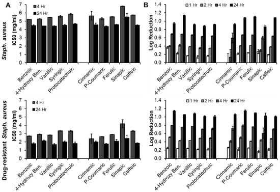 Log reductions are shown in Figure 6B, with all maximum log reductions observed at 24 h for both strains. Similarly to the IC50 measurements, no trends were seen between PAs with similar ring structures from the BA and CA groups. There were no clear trends between ring structures and log reduction for native Staph. aureus, but syringic and sinapic acids, with one hydroxyl and two methoxy groups both had the lowest bacterial reduction at 24 h. This result could be attributed to increased steric hindrance with increased bulky groups on the rings that prevents effective interaction with the bacteria. For drug-resistant Staph. aureus, a general trend of decreased log reductions with increased ring pendant groups can be seen for both BA and CA-based PAs. When comparing the native and drug-resistant strains, drug-resistant Staph. aureus had generally higher log reductions at 4 h and similar log reductions at 24 h.