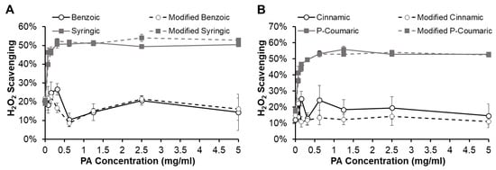 Antioxidant properties of modified phenolic acids in comparison to their unmodified controls as quantified by hydrogen peroxide scavenging capabilities from the (A) benzoic acid group and (B) cinnamic acid group. n = 3, mean ± standard deviation displayed.