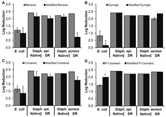 Antimicrobial properties of modified (A) benzoic, (B) syringic, (C) cinnamic, and (D) P-coumaric acids in comparison to their unmodified controls. Antimicrobial properties were quantified by log reduction in colony forming unit counts. * p < 0.05 relative to unmodified control. n = 3, mean ± standard deviation displayed.