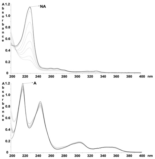 Absorbance spectra recorded on the ethanol solution of NA and A at the following exposure times: 0, 10, 30, 50, 70, 100, 130, 150, 210, 270, 300 min.