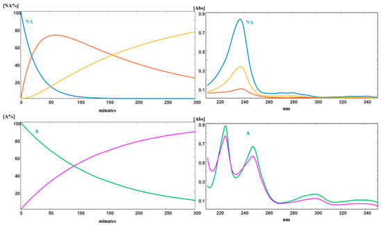 Photodegradation of NA and A: kinetic profiles and absorbance spectra of the pure compounds and respective photodegradation products.