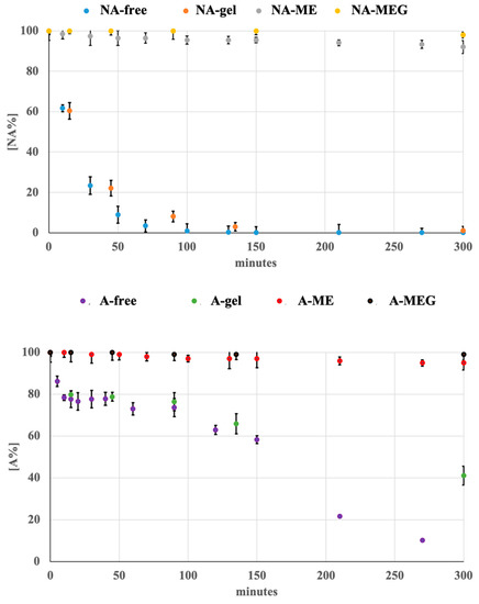 The stability of the compounds was also investigated by preparing the ME-drug in gel with 0.2% of the drug. The data obtained from the photodegradation experiments were processed by MCR and the kinetics parameters were calculated. The photodegradation profiles of these formulations followed a first-order kinetics. Table 2 summarizes the degradation rate constants and the values of t0.1 and t0.5 for the tested matrices. In Figure 4, the photodegradation profile of all the ME and MEG formulations were compared with the ethanol solutions and plain gels for NA and A, respectively.
