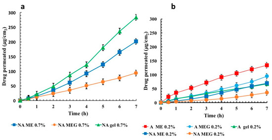 As shown in Figure 6, the permeation of A both from ME and MEG 0.2% was found, respectively, 1.94 and 2.64 higher than that obtained for NA. Moreover, a permeation rate of A 0.2% in MEG after 7 h (94.46 µg/cm2) was comparable with that recorded for NA 0.7% in the same system (93.87 µg/cm2), confirming a better performance of the new compound. This makes possible the use of lower drug doses avoiding more toxic effects.