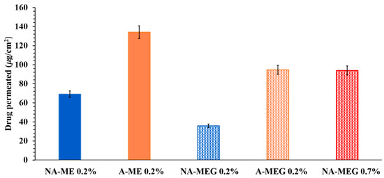 The calculated percentages for the applied dose after 7 h were 30.11%, 21.3%, and 15.16% for A-ME 0.2%, A-MEG 0.2%, and A gel 0.2%, respectively and 8.35%, 12.30%, and 17.33 % for NA-MEG 0.7%, NA-MEG 0.7%, and NA gel 0.7%.
