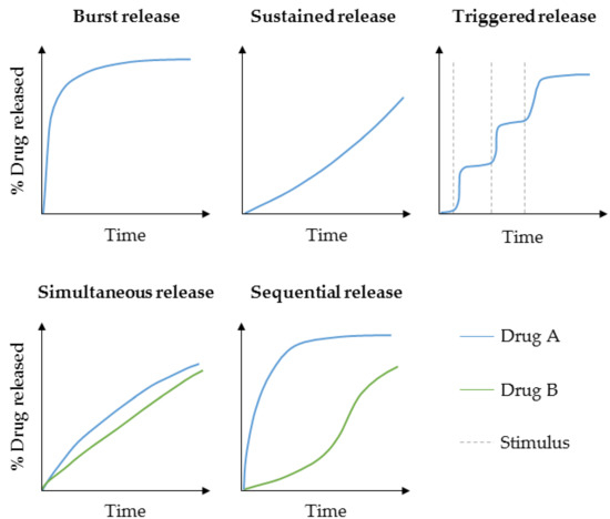 Exemplary schematic drug release kinetics for single and dual drug delivery.