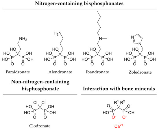 By investigating bone healing of rat tibial defects over 8 weeks, Park and coworkers found increased bone formation and mineralization after application of alendronate-loaded calcium phosphate scaffolds. In vitro, alendronate (Figure 2) displayed a sustained release over 28 days. Thereby, scaffolds incorporating high alendronate concentration (5 mg/scaffold) had a diminished release profile as only 20% of the drug was released after 4 weeks in comparison to lower alendronate concentration (1 mg/scaffold), where 70% of the bisphosphonate were released [65]. Apart from osteogenesis, implant loosening often remains challenging and drug delivery approaches should address this issue. According to several in vivo studies, strontium-modified calcium phosphate implants support osseointegration and local bone formation in a rat osteoporotic femoral defect model over an investigation period of 6 weeks and 6 months [66,67]. For instance, Tao and coworkers focused on a drug delivery system composed of strontium-modified calcium phosphate cement and an additional single local administration of BMP-2 (5 µg/mL). In osteoporotic rats, the strontium-containing scaffold as well as the combination of this scaffold with BMP-2 led to an increased bone formation of critical-size femoral defects after 8 weeks [68]. For similar investigation of strontium-doped calcium phosphate cements, Reitmaier and coworkers used critical-size bone defects in sheep. Local strontium release resulted in enhanced bone formation after 6 months, but not after short-term treatment [69]. Consequently, calcium phosphates meet several aspects of the diamond concept for ideal bone implants as these scaffolds provide structural support and feasibility of incorporating a variety of different adjuvant drugs.