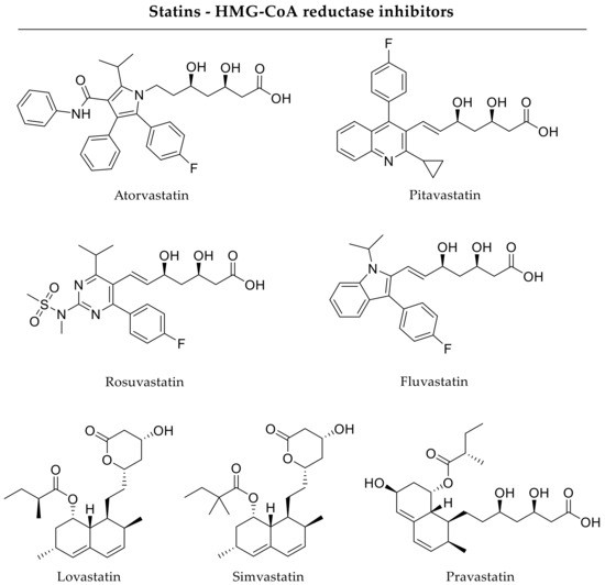 Furthermore, incorporation of adjuvant drugs in scaffolds for bone regenerative applications is required to ensure optimal fracture healing. By the use of simvastatin-loaded calcium sulfate scaffolds, Huang and coworkers indicated accelerated bone formation in a rabbit ulnar defect model. Regarding release kinetics of the HMG-CoA reductase inhibitor simvastatin (Figure 3), over 70% of the drug was released within 2 weeks, with a higher simvastatin loading resulting in a reduced release rate. In vivo, simvastatin-loaded scaffolds promoted bone regeneration in the same magnitude as calcium sulfate scaffolds loaded with BMP-2 resulting in similar newly formed bone tissue areas up to 8 weeks after implantation [58]. In addition, Nyan and coworkers investigated simvastatin (1 mg/scaffold) delivery by calcium sulfate discs and showed an improved bone formation in a rat critical-size calvarial defect model after 8 weeks compared to untreated controls or unloaded scaffolds [59]. In in vitro investigations, Khurana and coworkers analyzed pitavastatin-loaded injectable calcium phosphate foams. The foams released pitavastatin (Figure 3) by an initial burst. In vitro, pitavastatin delivery increased BMP-2 and VEGF expression indicating advantageous osteogenic and angiogenic effects [60]. Furthermore, pravastatin (Figure 3) can be used in bone regenerative applications as well. Delivery approaches based on local release forms of pravastatin have not been studied comprehensively yet, but oral administration in ovariectomized rats prevented bone loss indicating advantageous effects on bone metabolism [61]. In general, statins elicit pleiotropic effects [62]. Of note, statins inhibit HMG-CoA reductase, which is the rate-limiting enzyme in the mevalonate pathway responsible for the production of non-sterol and sterol isoprenoids, especially cholesterol. Thus, they became prominent lipid-lowering agents for the treatment of hypercholesterolemia [63]. In addition, statins can activate the AKT1/PI3K (protein kinase B/phosphatidylinositol 3-kinase) signaling pathway, which leads to some similar downstream effects as the inhibition of HMG-CoA reductase. The mevalonate pathway, on the other hand, can also be inhibited at other sites, such as the conversion of dimethylallyl pyrophosphate to geranyl pyrophosphate by bisphosphonates. This association points to another possible pleiotropic effect of statins. In fact, the statins have gained attraction as a pro-osteogenic molecule after first indications that lovastatin (Figure 3) can stimulate the production of important osteogenic growth factors [64].
