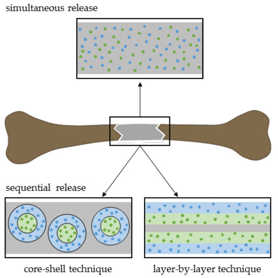Most commonly, therapy strategies have focused on drug release of a single compound. However, bone healing, as a complex process, requires a well-orchestrated interplay of multiple factors at certain bone repair phases to affect key events like osteogenesis, angiogenesis, and inflammation. By applying several drugs simultaneously or sequentially, potential synergistic effects might strengthen bone regeneration. For instance, combining angiogenic and osteogenic signals or anabolic and anti-resorptive effects are desirable. Kim and Tabata summarized a multitude of dual drug delivery systems for simultaneous or sequential drug release in vitro and in vivo [167]. The authors concluded that carrier composition for drug encapsulation, drug ratio as well as time and place have to be considered to establish an optimal delivery system. Thereby, dual drug loading can rely, for instance, on layer-by-layer or core-shell strategies (Figure 7) [12,167,168]. In the following part, several dual drug delivery studies will be described in detail.