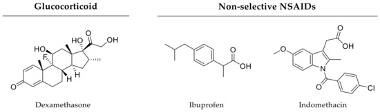 Chemical structures of selected anti-inflammatory drugs. Both glucocorticoids and NSAIDs are inflammation-modulatory small molecules inhibiting cyclooxygenase isoforms and prostaglandin production. These drugs mainly impair bone repair, as prostaglandins are crucial during early bone healing phases.
