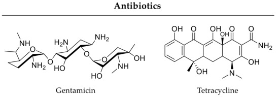 Chemical structures of selected antibiotics. Gentamicin prevents bone infections, whereas tetracycline inhibits osteoclast differentiation and displays a high affinity to bone minerals as well.