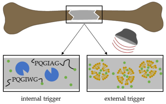 During crucial bone healing phases, controlled drug release as a response to a certain stimulus at a defined time point represents an improvement of current therapy strategies. Triggered drug delivery reduces the initial burst release, which is typical for diffusion-dependent drug release. On-demand release kinetics optimize drug specificity, quantity, and reduce drug toxicity. The physiological environment including active enzymes and pH, or external stimuli like temperature, physical fields, light, or ultrasound (Figure 10), are feasible triggers in designed drug delivery systems [12,35,205,206,207,208,209,210,211,212,213,214,215].