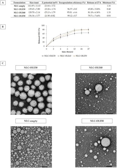 Physico-chemical characterization of freeze-dried nanostructured lipid carriers: empty (NLC-empty) and oleuropein (OLE) loaded, with a targeted OLE loading of 30% (NLC-OLE30), 40% (NLC-OLE40) and 50% (NLC-OLE50) (w/w). (A) Particle size, Z potential, encapsulation efficiency, total released OLE and moisture content of NLCs. (B) In vitro release of OLE from developed NLCs. (C) TEM micrographs of OLE-loaded and empty nanoparticles. The scale bar indicates 100 nm.