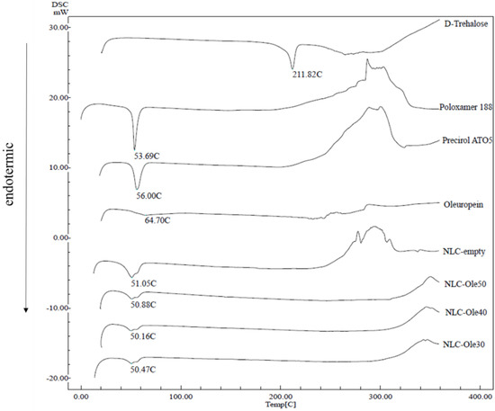 Differential scanning calorimetry (DSC) graphs of pure excipients (D-trehalose, Poloxamer 188, Precirol ATO 5, oleuropein (OLE), developed nanoparticles with OLE (NLC-OLE30, NLC-OLE40, NLC-OLE50), and without OLE (NLC-empty).