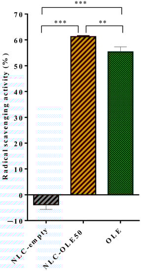The main bioactivity of OLE is related to its ability to eliminate free radicals and prevent lipid peroxidation, which, in the end, contributes to alleviate the injuries caused by oxidative stress as described elsewhere. Given this, the next step of this work was to verify that the antioxidant activity of OLE was not disturbed by the nanoformulation process, and thus the radical scavenging activity of NLC-OLE50 was assayed. As shown in Figure 3, free OLE had an antioxidant power of 55.33 ± 1.94%, which was significantly enhanced by its incorporation in NLCs (61.22 ± 0.38%). These results could be ascribed to the higher specific area of the nanoparticles for chemical quenching as well as the protection of the polyphenol against external agents into the lipid matrix. Similarly, the encapsulation of other natural compounds such as beta-carotene or quercetin into protein-based and polyvinyl alcohol–based nanoparticles, respectively, and the co-loading of tocopherol and ascorbic acid in nutriosomes have been shown to significantly improve their DPPH radical scavenging activity [64,65,66]. It is worth noting that unloaded-NLCs did not exhibit any radical scavenging activity (−3.84 ± 1.79%) and thus, the lipid excipients of the carrier had no influence on the antioxidant power of NLC-OLE50. Hence, we demonstrated that the nanoencapsulation process through the hot-melt homogenization technique did not decrease OLE activity but improved it.