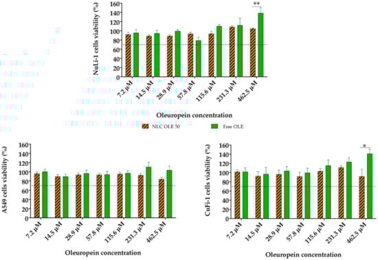In light of the characterization results, NLC-OLE50 seemed to be a promising carrier for OLE with enhanced antioxidant activity and thus we continued to study its efficacy in lung epithelial cell models. Several authors have reported micro- and nanoencapsulation methods for olive leaf extracts but to the best of our knowledge, there is a lack of studies regarding the impact that the formulation process could have on the bioactivity of this polyphenol in a biological system [22,23,52].