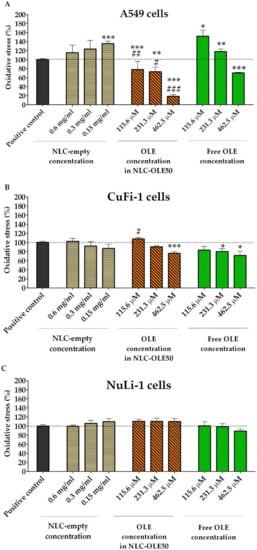 Antioxidant activity of free oleuropein (OLE), encapsulated OLE (NLC-OLE50), and empty nanoparticles (NLC-empty) in ABAP-stressed A549 (A), CuFi-1 (B), and NuLi-1 (C) cells. The mean percentages of DCF fluorescence, as a measure of oxidative stress, are shown in relation to the positive control (set to 100%). Results shown are means ± SEM of at least three independent experiments. * p < 0.05, ** p < 0.01, *** p < 0.001 vs. positive control; # p < 0.05, ## p < 0.01, ### p < 0.001 vs. free OLE.