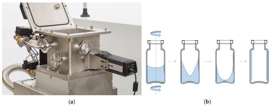 (a) Picture of a Rheavita spin-freezer with the thermal camera in front of a germanium window and (b) the graphical representation of the spin-freezing concept. Adapted with permission from Corver J., Eur. Pharm. Rev.; published by Russell Publishing Ltd., [30].
