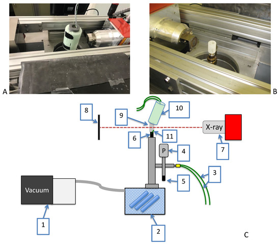(A) CT set-up with spin-frozen vial wrapped with insulating fabric surrounded by X-ray source and detector. (B) Spin-frozen vial without insulation (merely to illustrate the positioning of the vial). (C) 1: Vacuum pump; 2: Condenser; 3: Frozen product thermocouple read-out; 4: Proportional pressure valve; 5: Pirani gauge; 6: Vial manifold 7: X-ray source; 8: Detector; 9: Spin-frozen vial; 10: Heating pad wrapped with insulating fabric.; 11: thermocouple located inside vial at vial neck.