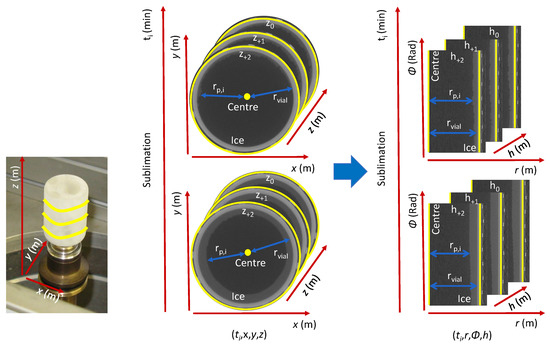 Tomographic reconstruction of all scans was performed using the in-house CTrex software (UGCT, Ghent, Belgium). For all 3D volumes, i.e., each time point (), the data-structure was converted from a cartesian coordinate system (x, y, z), with 1300 segmentations in each direction at a voxel size of (30 m), to a cylindrical coordinate system (r, , h) with 650 radial (r), 1600 azimuthal () and 1300 height (h) segmentations which resulted in a 4D matrix (, r, , h) as represented in Figure 3. The amount of x-rays absorbed by an object is defined by Beer’s law as a function of the attenuation coefficient and thickness of a material. The dried product layer formed during freeze-drying has a negligibly low attenuation coefficient in comparison with the dense frozen product and glass layer. Therefore, only the frozen product layer could be segmented from the vial-assembly by thresholding the greyscale value per voxel. At last, for all (, , h) coordinates the inner radius of the frozen product layer () and inner vial wall () was calculated.