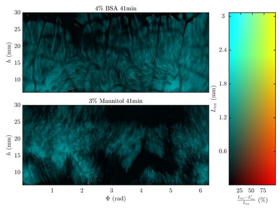 Graphical representation of the relative difference of the frozen product thickness () and integrated frozen product length () for every (, h) coordinate by means of a 2D-colour scale (right) for 4% BSA (top left) and 3% mannitol (bottom left) at 41 min.