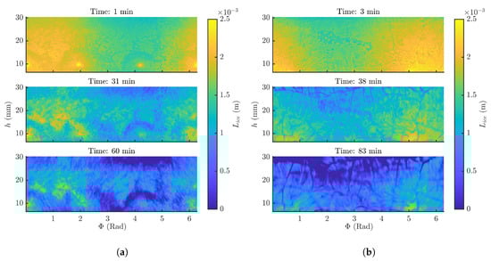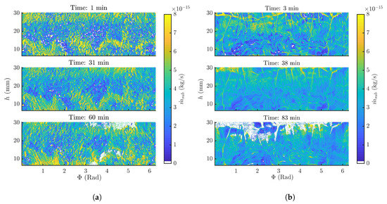 The sublimation rate was derived from the decrease in ice layer thickness for every (, h) coordinate as described in Equation (4). The sublimation rate distributions at multiple time points of the mannitol and BSA formulation are represented in Figure 6a,b, respectively. As visualised in these figures, local differences in sublimation rate across the entire vial were present, revealing a possible distribution in . These local differences were observed for both formulations, indicating that sublimation rate distributions over the vial might be present regardless of the solid state of the dried product.