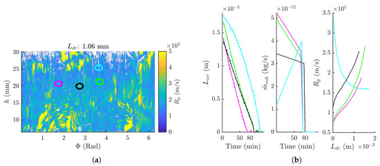 can be expressed in function of time or in function of dry layer thickness (). The dry layer thickness was calculated per azimuthal and height coordinate according to Equation (6). Note that not necessarily every (, h) coordinate reaches the same dry layer thickness at an identical point in time.