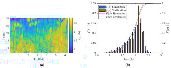 (a) Distribution of primary drying endpoint () for a simulation of a spin-freeze dried 10R vial with 3.5 ml 4% BSA formulation at a chamber pressure of 10 Pa and total power towards the vial of 1.2 W and (b) End of primary drying () histograms (—left axis) and cumulative distribution (—right axis) for both the simulation (Section 3.4) and the verification (Section 3.5).