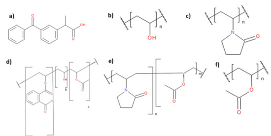 Molecular structures of (a) ketoprofen, (b) polyvinyl alcohol (PVAlcohol), (c) polyvinyl pyrrolidone (PVP), (d) polyvinyl acetate phthalate (PVAP), (e) polyvinyl pyrrolidone vinyl acetate (VP:VA), (f) polyvinyl acetate (PVAcetate).