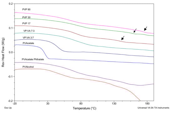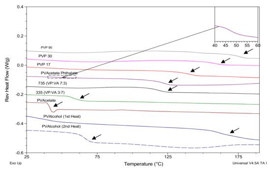 The polymer with the highest glass transition temperature is PVP90, followed by PVP30 and PVP17. As would be expected, the glass transition temperature increases with increasing molecular weight [23]. The glass transition temperature appears to reduce with increasing vinyl acetate substitution. The glass transition onset temperature of polyvinyl acetate is 38 °C, so as the substitution ratio of the vinyl acetate moiety increases, the glass transition temperature of the polymer approaches the glass transition temperature of polyvinyl acetate.