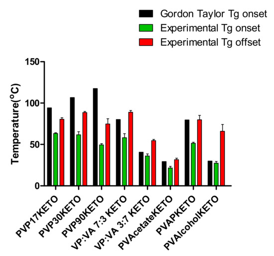 The deviation between experimental and predicted glass transition onset temperature of the polymer–ketoprofen systems (POLYMERKETO) systems are detailed in Supplementary Material Table S1 and graphed in Figure 5.