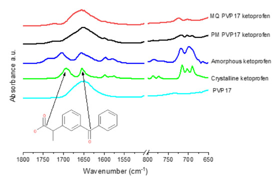As shown in Figure 7 and Supplementary Material Figures S4 and S5, PVP has one strong signal in the carbonyl region centered at 1653 cm−1, corresponding to the carbonyl of the vinyl pyrrolidone ring. The physical mixtures (PM) of PVP17, PVP30 and PVP90 with 20% w/w ketoprofen appear to simply be an overlay of the IR spectra of each component, with the 3 peaks attributed to crystalline ketoprofen visible in the fingerprint region.