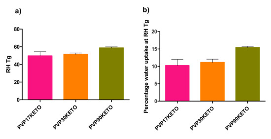 There was no statistically significant difference in the RHTg between the PVP30KETO system and the other molecular weight PVP systems studied. A trend is apparent however, as shown in Figure 8a. As the molecular weight of PVP increases, the RH required for RHTg to occur increases. The mean RHTg (± standard error) for PVP17KETO, PVP30KETO and PVP90KETO was 49.61 ± 4.83, 51.44 ± 1.54 and 58.71 ± 1.16 %RH, respectively. This is likely due to the effect that increasing molecular weight has on increasing the thermal glass transition (Tg = 136 °C, 154 °C and 172 °C for PVP17, 30 and 90 respectively, Table 2). The higher molecular weight PVP systems therefore require a higher RH to be reached before the amount of water sorbed plasticizes the system to a sufficient degree to enable a moisture induced glass transition to occur at 25 °C. The higher molecular weight may mean that the water has more difficulty diffusing through the powder due to reduced molecular mobility caused by the high viscosity of the polymer.