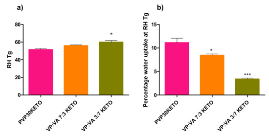 (a) The relative humidity at which a glass transition was induced for polymer–ketoprofen systems of differing VP:VA substitution ratios. (b) The mass percentage of water uptake for polymer–ketoprofen systems at the relative humidity induced glass transition for differing VP:VA substitution ratios. Statistically significant difference (p < 0.05) from PVP30KETO system denoted by *. Highly statistically significant difference (p < 0.001) from PVP30KETO system denoted by ***.