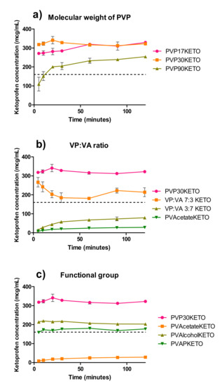 As seen in Figure 10a all PVP–ketoprofen systems reach supersaturation relative to crystalline ketoprofen within two hours. The PVP90KETO system was slower to reach supersaturation than the lower molecular weight PVPKETO systems, which is likely due to the high viscosity of this polymer. The total degree of supersaturation is lower for PVP90KETO relative to the other two PVP polymers over two hours, although it is clear the degree of supersaturation is increasing with time. If the experiment had been conducted over a longer time frame, PVP90KETO may have attained the same degree of supersaturation as the lower molecular weight PVP systems, but this would not have been physiologically relevant. Interestingly, PVP30KETO reached supersaturation faster than PVP17KETO, which is a surprising result considering that the viscosity of PVP17 is lower than that of PVP30.