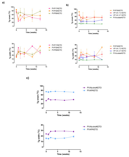 Glass transition onset temperatures and glass transition temperature width of (a) PVPKETO, (b) VP:VA KETO and (c) PVAlcoholKETO and PVAPKETO systems stored at 75% RH at 25 °C for 12 weeks.