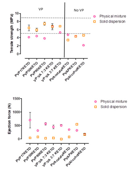In general, the solid dispersion tablets have higher tensile strength and require less force for die-ejection than the physical mix, with some notable exceptions. The VP:VA 7:3 KETO and PVAPKETO solid dispersion tablets had very similar tensile strengths to their equivalent physical mixtures. The PVAcetateKETO solid dispersion tablets were weaker than their equivalent physical mixture. This may be explained by considering that the PVAcetateKETO system has a glass transition onset temperature (21 °C) very close to room temperature and therefore exists in the rubbery state at test conditions. This may mean that the mechanism by which the tablet deforms and breaks is different from the equivalent crystalline or amorphous state. This was observed experimentally as the PVAcetateKETO tablets were malleable and the force applied by the hardness testing machine resulted in tablet deformation rather than breakage, in contrast to what was observed for all other systems. In addition to this, it was observed that the PVAcetateKETO system formed large rubbery clumps when allowed to equilibrate to room temperature, and as tensile strength is known to be inversely related to particle size [43], this result is not entirely unexpected.