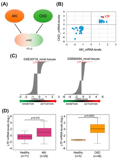 Upregulation of LTF in the kidney tissues of acute kidney injury (AKI) and chronic kidney disease (CKD) patients. (A) Expression microarray analysis determined 62 overlay genes at a threshold of two-fold change (FC) in the kidney tissues of AKI and CKD patients. (B) The dotplot for the mRNA levels (log2) of the 62 consensus genes were shown. (C) The mRNA levels in the kidney tissues of AKI (GSE30718) and CKD (GSE66494) patients at a threshold of 1.5-FC. (D) The mRNA levels of LTF were upregulated in the kidney tissues of AKI and CKD patients.