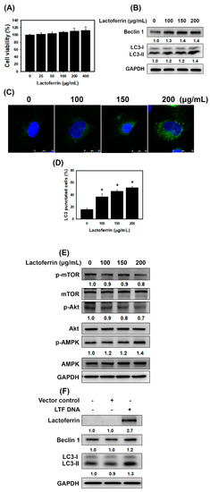 Lactoferrin induces autophagy in HK-2 cells. (A) Cell viability of lactoferrin-treated cells. Cells were treated with various concentrations of lactoferrin for 24 h. * p < 0.05 compared with control. (B) The protein levels of LC3 and beclin 1 in HK-2 cells treated with lactoferrin for 24 h. (C) Confocal immunofluorescence microscopy imaging of LC3 following 24 h treatment with lactoferrin. (D) Quantification of punctate LC3 staining. Cells were treated with various concentrations of lactoferrin for 24 h. * p < 0.05 compared with control. (E) Protein levels of Akt/mTOR and AMPK pathways. Cells were treated with various concentrations of lactoferrin for 24 h. (F) Western blotting for lactoferrin, LC3 and beclin 1 proteins derived from HK-2 cells without (vector control) or with LTF overexpression for 24 h.