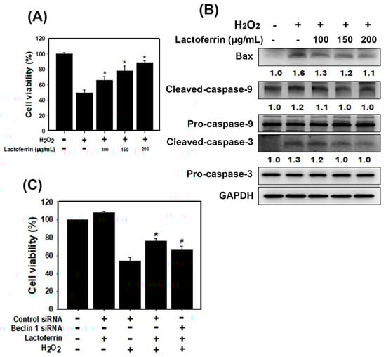 Hydrogen peroxide (H2O2) is an oxidant of inflammation that contributes to the pathogenesis of chronic diseases [23]. To address whether lactoferrin attenuates oxidative stress-induced damage, we analyzed the effect of lactoferrin on H2O2-induced damage by analyzing cell viability (Figure 3A). The results showed that lactoferrin substantially inhibited H2O2-induced cell death in HK-2 cells. Moreover, H2O2 increased apoptosis-related protein expression, including cleaved caspase-9, cleaved caspase-3, and bax (Figure 3B). Pretreatment with lactoferrin suppressed H2O2-induced apoptosis in HK-2 cells. To further validate the role of lactoferrin-promoted autophagy in H2O2-induced cell death, a beclin 1-targeting siRNA was designed and transfected into HK-2 cells. As shown in Figure 3C, beclin 1 siRNA-transfected cells displayed significantly decreased viability compared to that of cells transfected with control siRNA. These results suggest that lactoferrin inhibits oxidative stress-induced cell death and apoptosis, by augmenting autophagy.